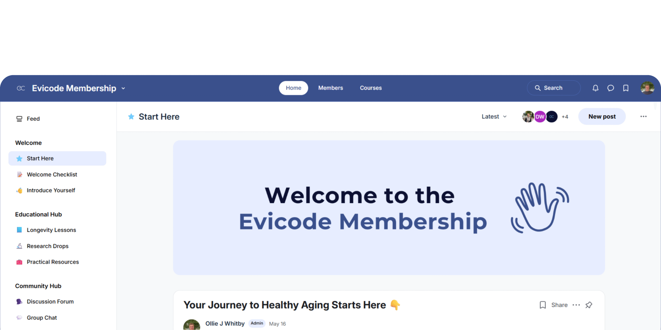 The Evicode membership includes scientist-led longevity masterclasses, regular simplified research insights, practical tools like food lists and habit guides, monthly challenges, and full access to a supportive community.